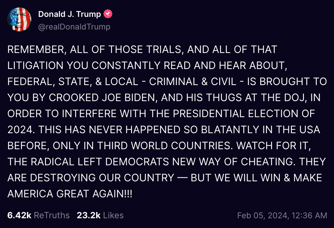 REMEMBER, ALL OF THOSE TRIALS, AND ALL OF THAT LITIGATION YOU CONSTANTLY READ AND HEAR ABOUT, FEDERAL, STATE, & LOCAL - CRIMINAL & CIVIL - IS BROUGHT TO YOU BY CROOKED JOE BIDEN, AND HIS THUGS AT THE DOJ, IN ORDER TO INTERFERE WITH THE PRESIDENTIAL ELECTION OF 2024. THIS HAS NEVER HAPPENED SO BLATANTLY IN THE USA BEFORE, ONLY IN THIRD WORLD COUNTRIES. WATCH FOR IT, THE RADICAL LEFT DEMOCRATS NEW WAY OF CHEATING. THEY ARE DESTROYING OUR COUNTRY — BUT WE WILL WIN & MAKE AMERICA GREAT AGAIN!!!