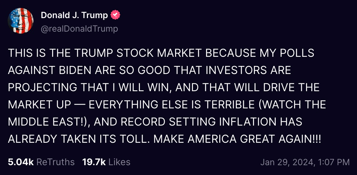 THIS IS THE TRUMP STOCK MARKET BECAUSE MY POLLS AGAINST BIDEN ARE SO GOOD THAT INVESTORS ARE PROJECTING THAT I WILL WIN, AND THAT WILL DRIVE THE MARKET UP — EVERYTHING ELSE IS TERRIBLE (WATCH THE MIDDLE EAST!), AND RECORD SETTING INFLATION HAS ALREADY TAKEN ITS TOLL. MAKE AMERICA GREAT AGAIN!!!
