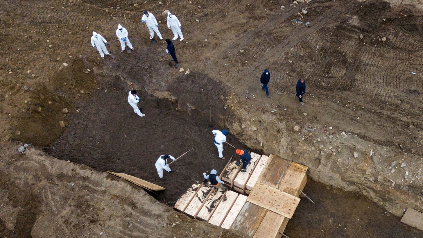and then Trump went on TV and told people to inject bleach — all while victims of the pandemic were stacked in hastily-constructed mobile morgues and then dumped into mass graves, because the bodies were piling up too goddamned fast.