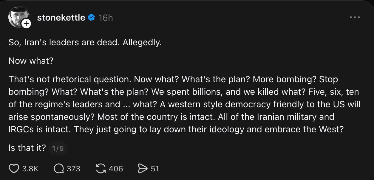 That's not rhetorical question. Now what? What’s the plan? More bombing? Stop bombing? What? What’s the plan? We spent billions, and we killed what? Five, six, ten of the regime’s leaders and ... what? A western style democracy friendly to the US will arise spontaneously? Most of the country is intact. All of the Iranian military and IRGCs is intact. They’re just going to lay down their ideology and embrace the West?