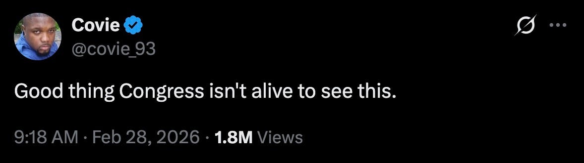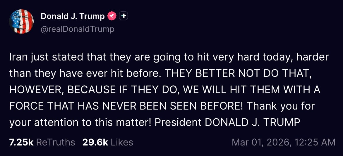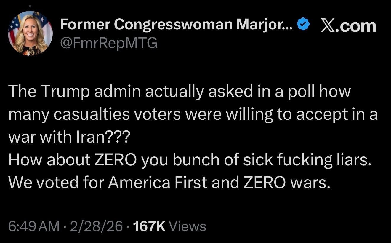 the US has launched Operation Epstein Distraction, and we’re now at war with Iran. a ‘war’ — that’s Dear Leader’s own word for it. not a ‘military operation,’ or ‘limited airstrikes,’ or any of the other cutesy phrases past presidents have used to dance around the fact that only Congress has the Constitutionally-mandated power to declare war.