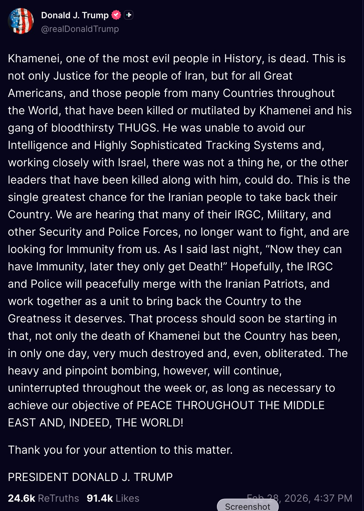 Ayatollah Khamenei is gone. you’re welcome, Iranians, now go figure out all that ‘regime change’ shit on your own.