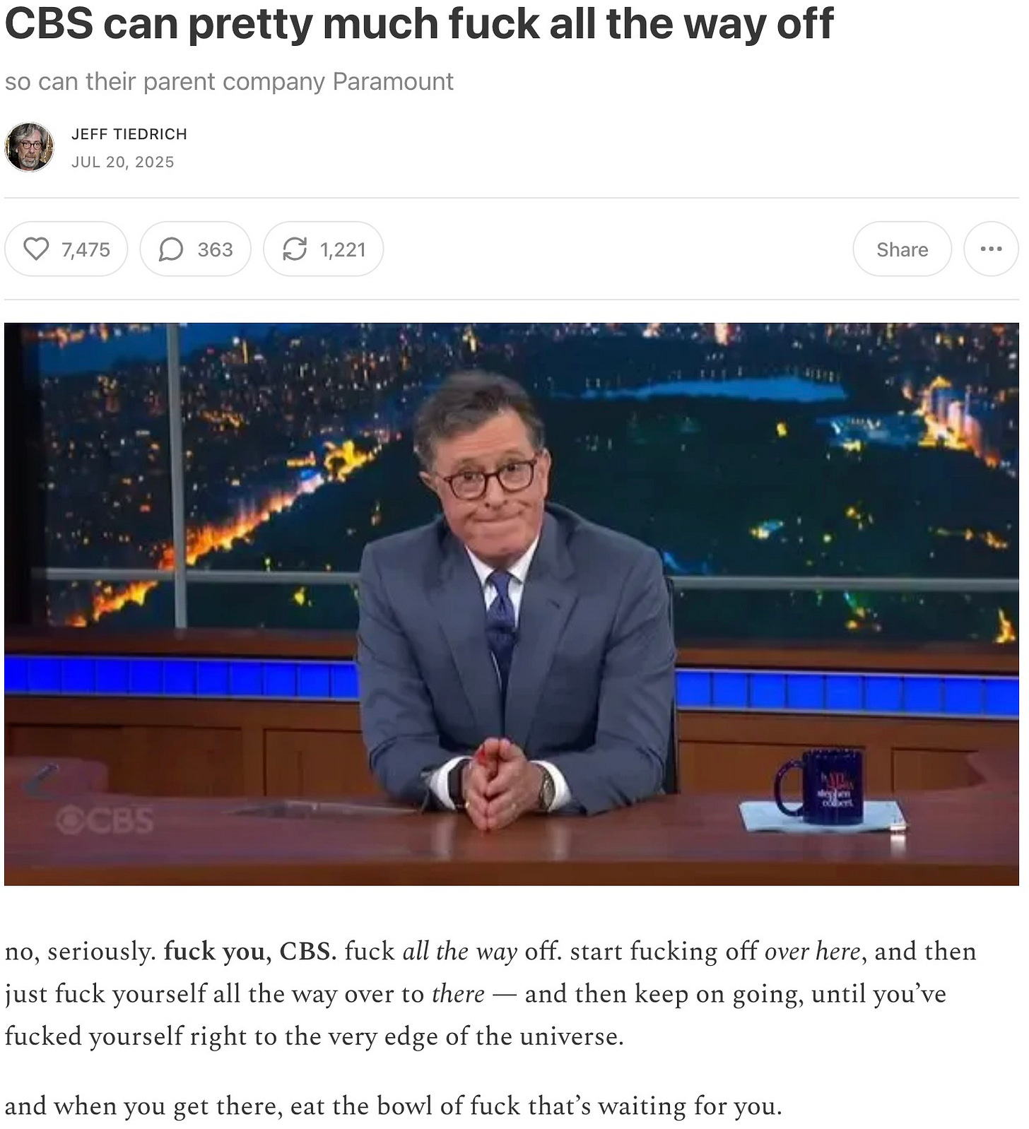 if those previous two sentences seem familiar to you, that’s because — with the exception of substituting ABC for CBS — it’s how I opened my July 20, 2025 post, ‘CBS can pretty much fuck all the way off.’