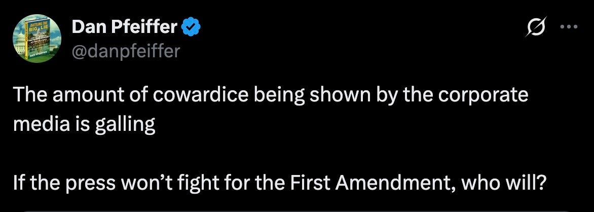 “The amount of cowardice being shown by the corporate media is galling If the press won’t fight for the First Amendment, who will?”