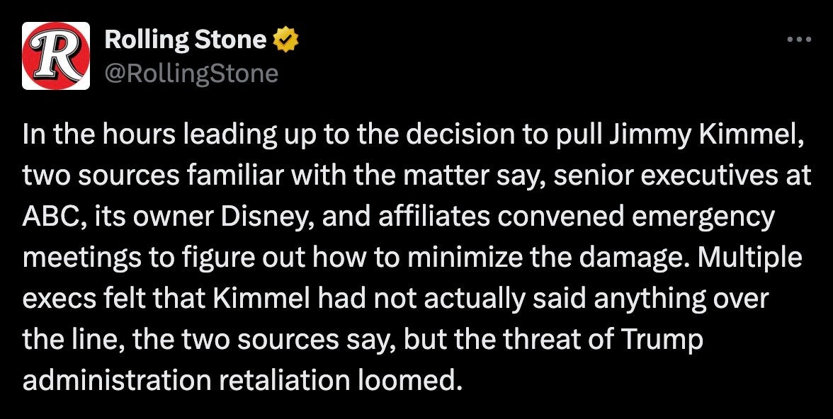 “In the hours leading up to the decision to pull Jimmy Kimmel, two sources familiar with the matter say, senior executives at ABC, its owner Disney, and affiliates convened emergency meetings to figure out how to minimize the damage. Multiple execs felt that Kimmel had not actually said anything over the line, the two sources say, but the threat of Trump administration retaliation loomed.”