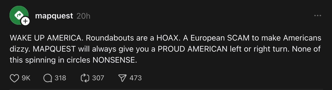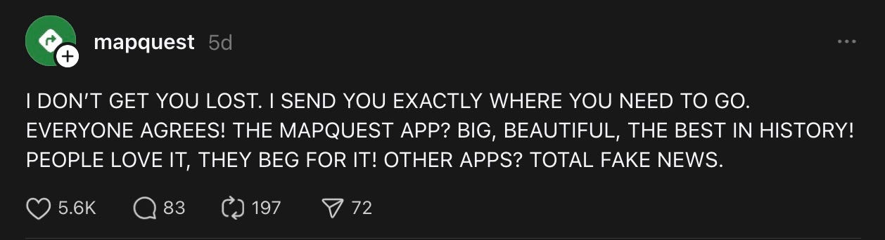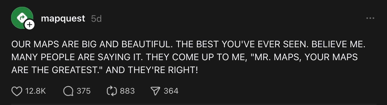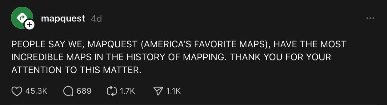Yeah, Mapquest’s socials deserve this praise. They’ve been great. Helps remind me there’s more of us—many more—than there ever will of them. And I’m not planning to surrender. Ever.