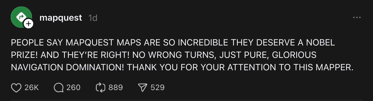 lastly, here’s someone who will def be welcomed straight into Heaven. it’s your hero of the day: whoever runs Mapquest’s social media account.