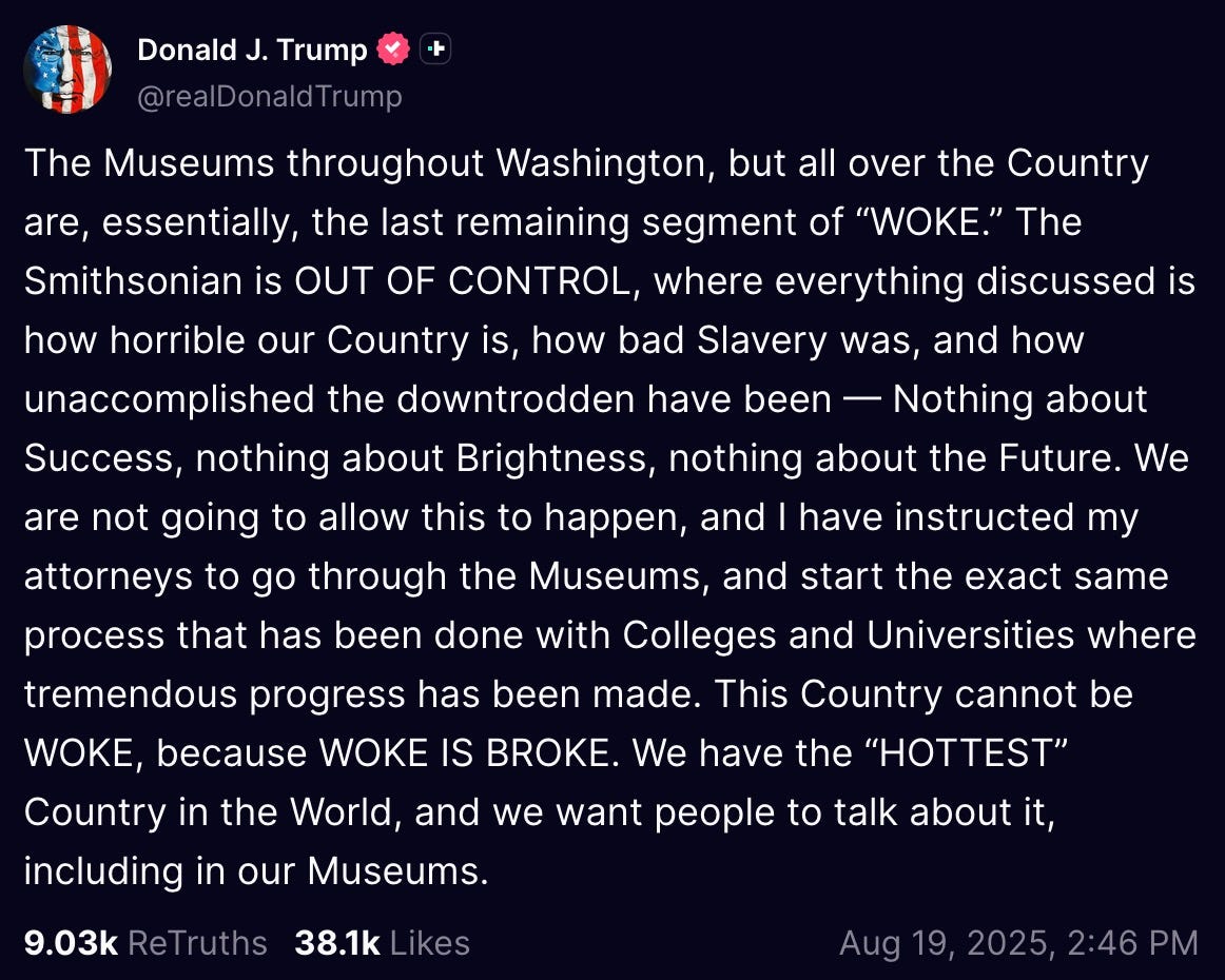 The Museums throughout Washington, but all over the Country are, essentially, the last remaining segment of “WOKE.” The Smithsonian is OUT OF CONTROL, where everything discussed is how horrible our Country is, how bad Slavery was, and how unaccomplished the downtrodden have been — Nothing about Success, nothing about Brightness, nothing about the Future. We are not going to allow this to happen, and I have instructed my attorneys to go through the Museums, and start the exact same process that has been done with Colleges and Universities where tremendous progress has been made. This Country cannot be WOKE, because WOKE IS BROKE. We have the “HOTTEST” Country in the World, and we want people to talk about it, including in our Museums.