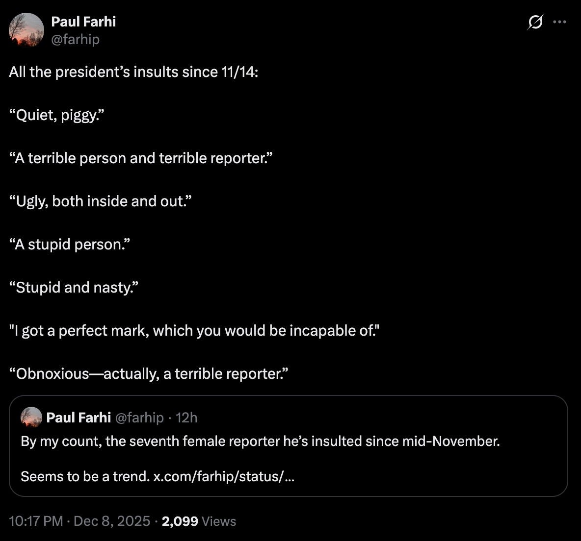 in the last month alone, Donny has insulted seven reporters — all of them women.
