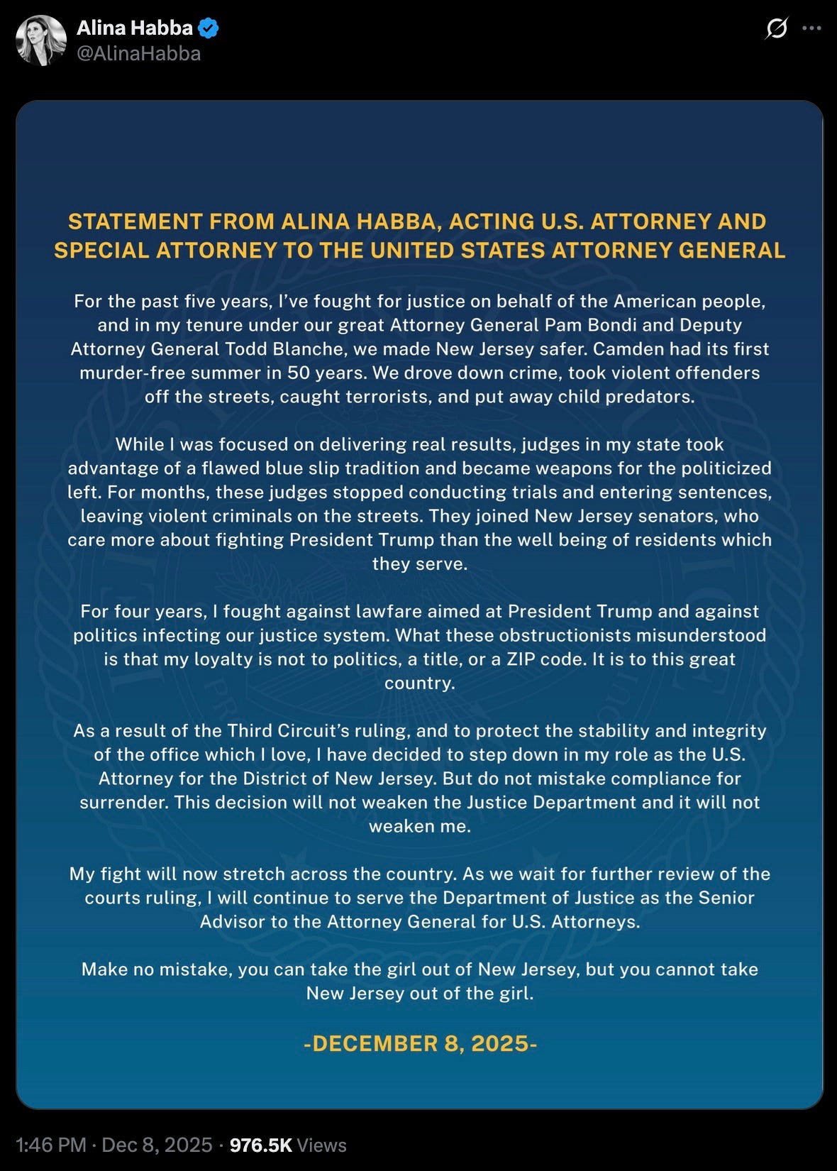 now, here’s the beauty part: the Acting US Attorney job that Habba ‘resigned’ is one she’d already been removed from months ago. that ruling was upheld last week by the Third Circuit.