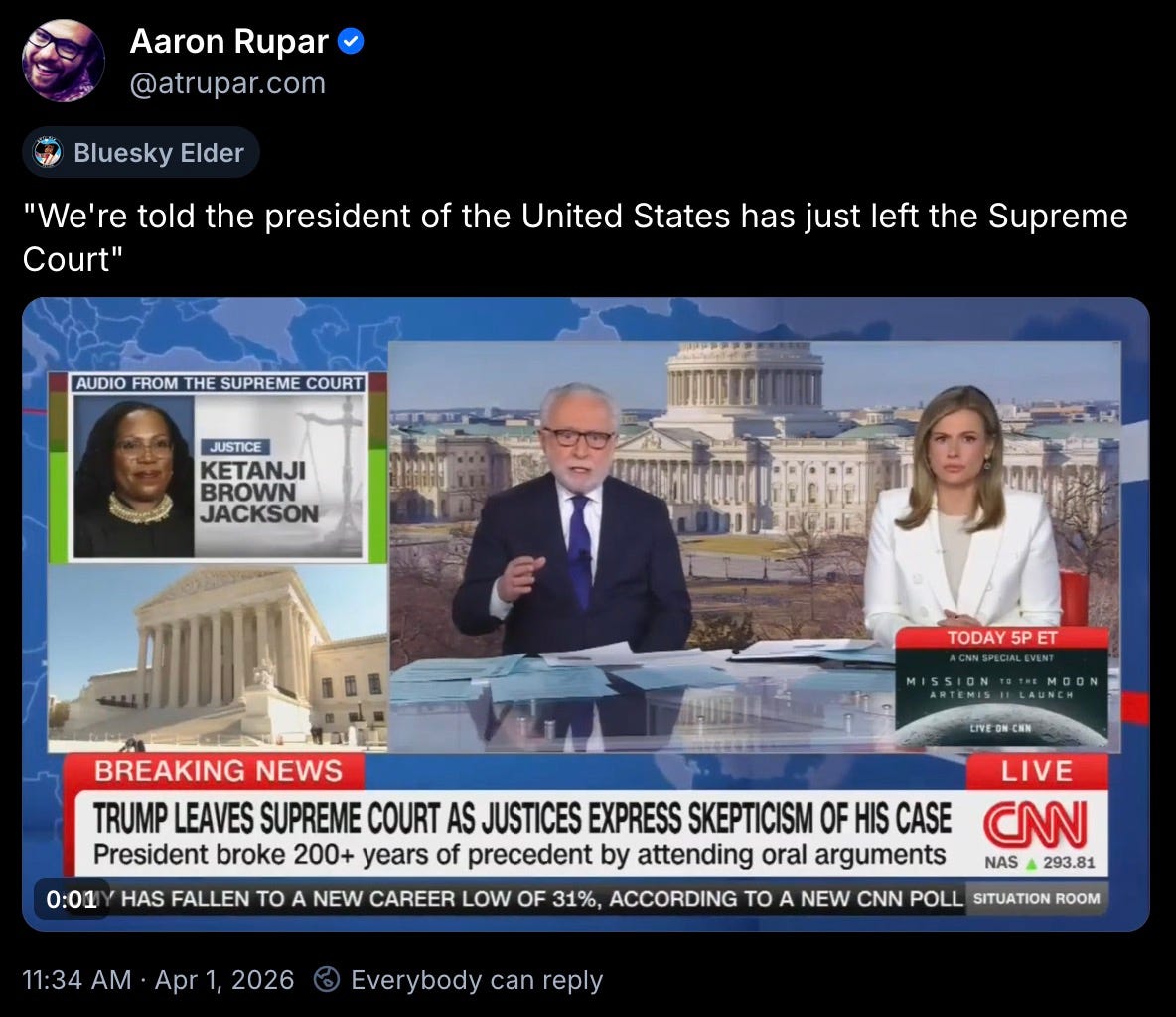 oh, and those Supreme Court oral arguments about birthright citizenship that Donny was so horny to attend yesterday morning? he bailed on them even before they were halfway over.