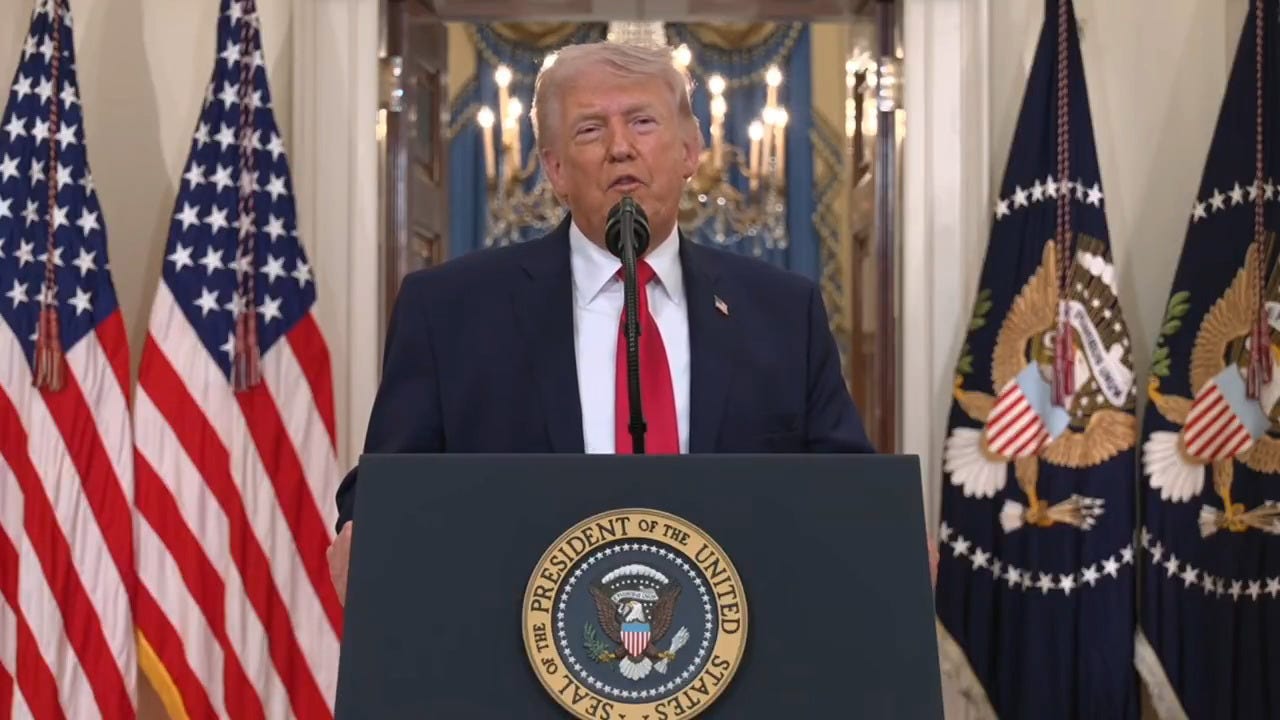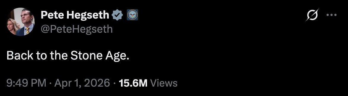 “thanks to the progress that we’ve made, I can say tonight we are on track to complete all of America’s military objectives shortly— very shortly. we are going to hit them extremely hard over the next two to three weeks. we’re gonna bring them back to the stone ages, where they belong.”