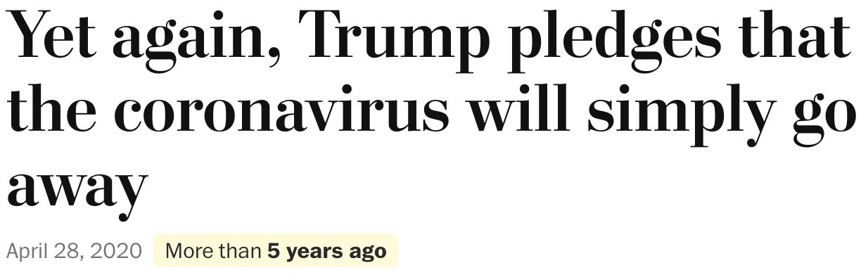 spoiler alert: covid never ‘went away.’ it’s still around, 6 years later. but because Donny chose to try to wish the problem away instead of addressing it, millions of people died.