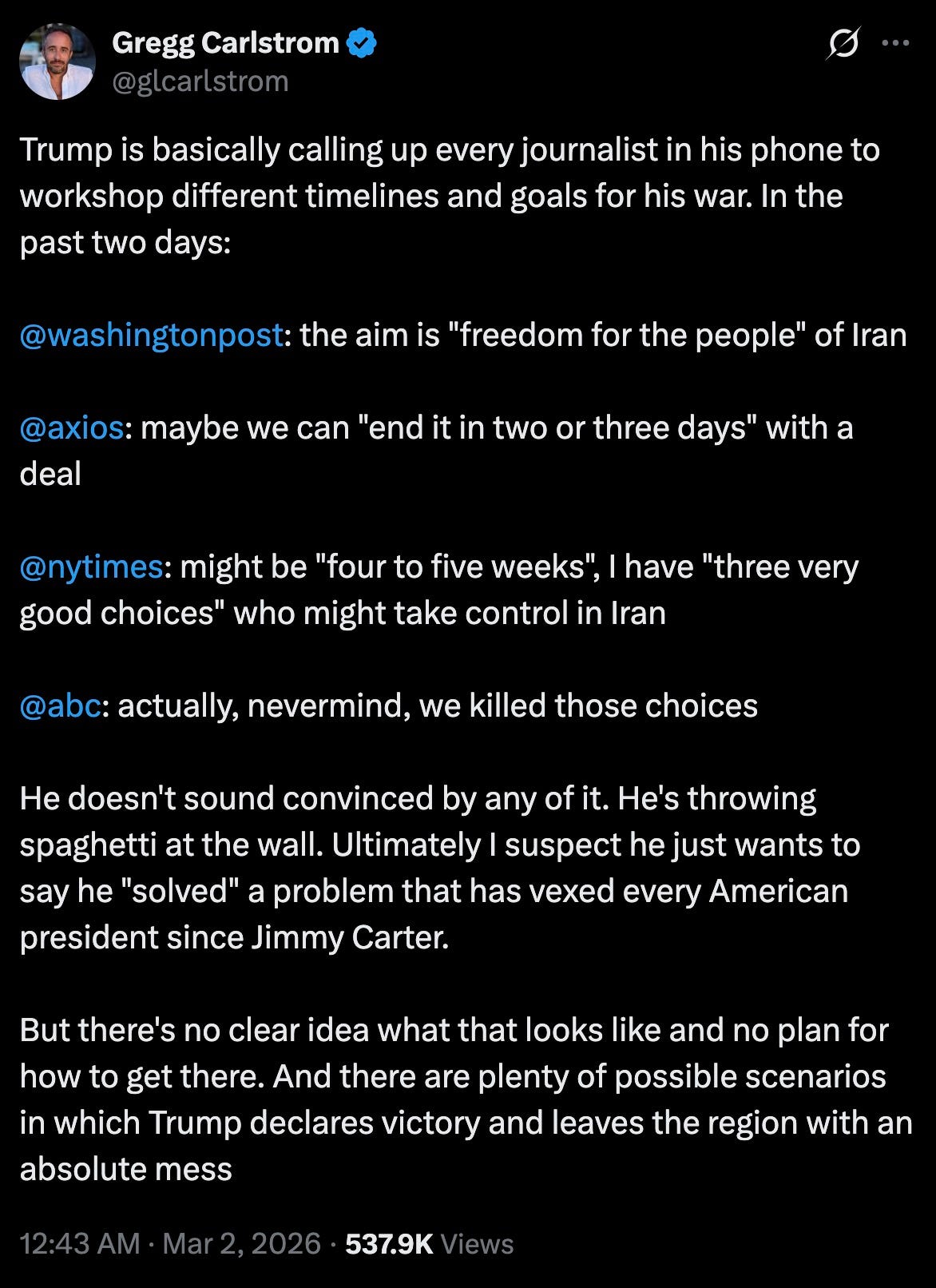 Trump is basically calling up every journalist in his phone to workshop different timelines and goals for his war. In the past two days: