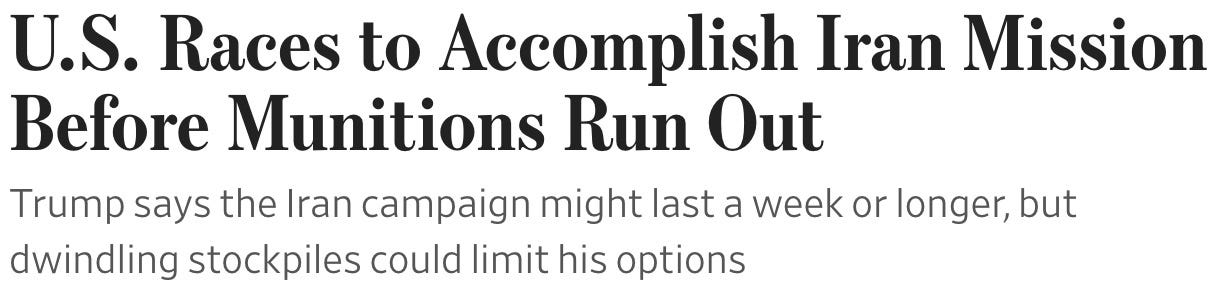 and what is this insanity? apparently, none of the shitwits running Operation Epstein Distraction expected Iran to fight back, and now we’re running out of munitions.