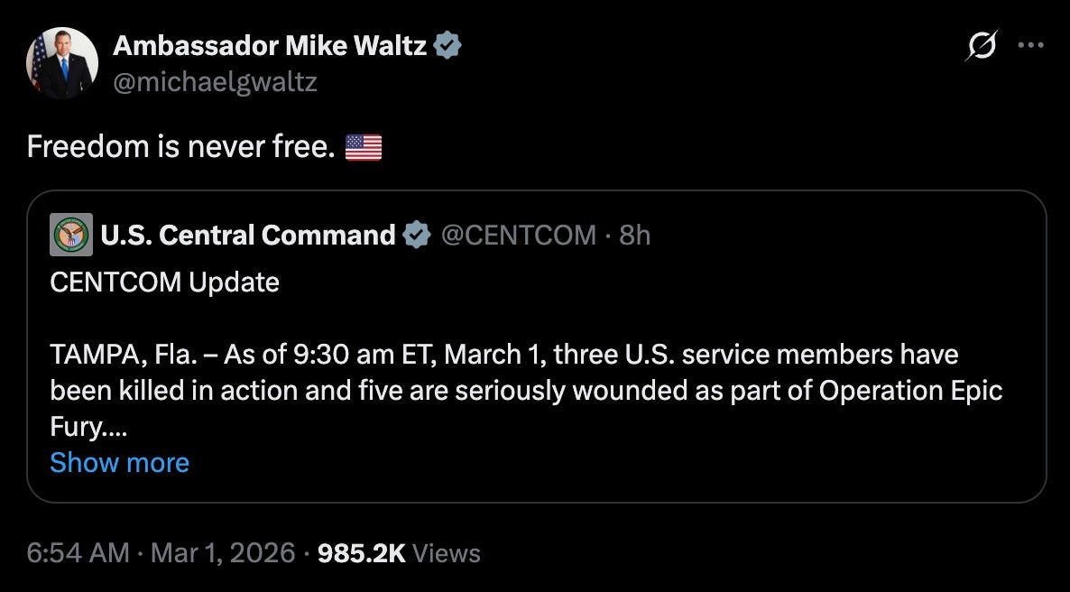 so, three (actually, four) US service members lost their lives in the line of duty yesterday.