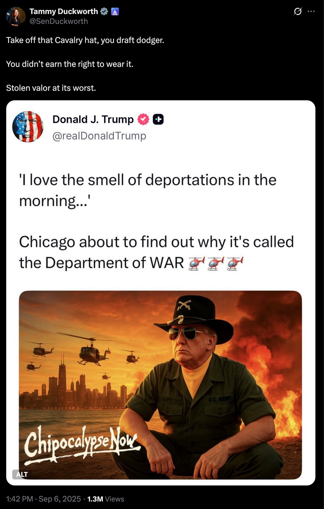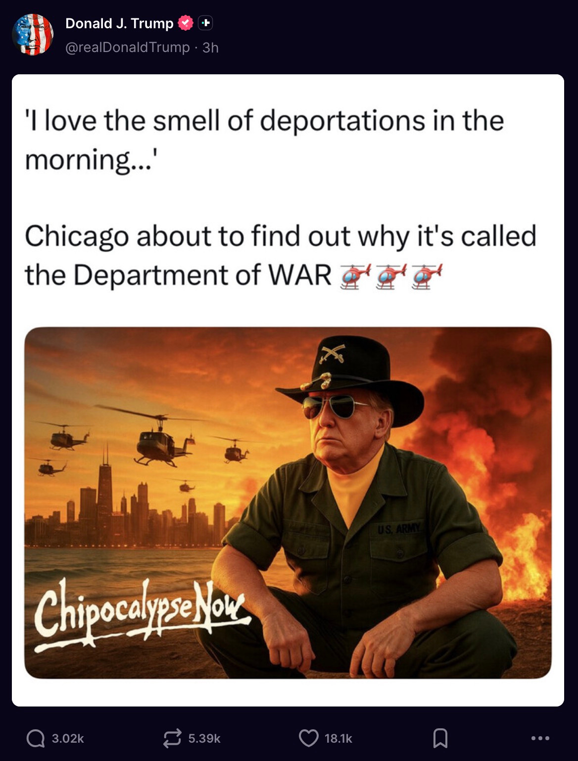 oh look, it’s some AI slop of Donny tarted up as Colonel Kilgore from Apocalypse Now, declaring war on Chicago. just a perfectly normal president doing perfectly normal stuff, right?