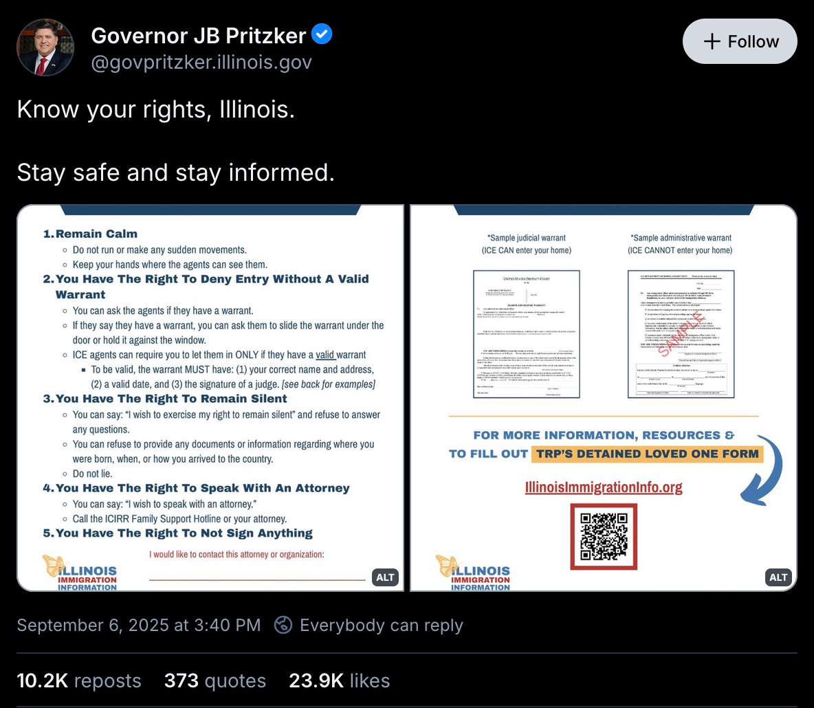 in any sane world, Governor Pritzker wouldn’t have to be explaining the difference between judicial warrants and administrative warrants. he wouldn’t have to be providing links to forms for children to fill out to find where their parents have been disappeared to.