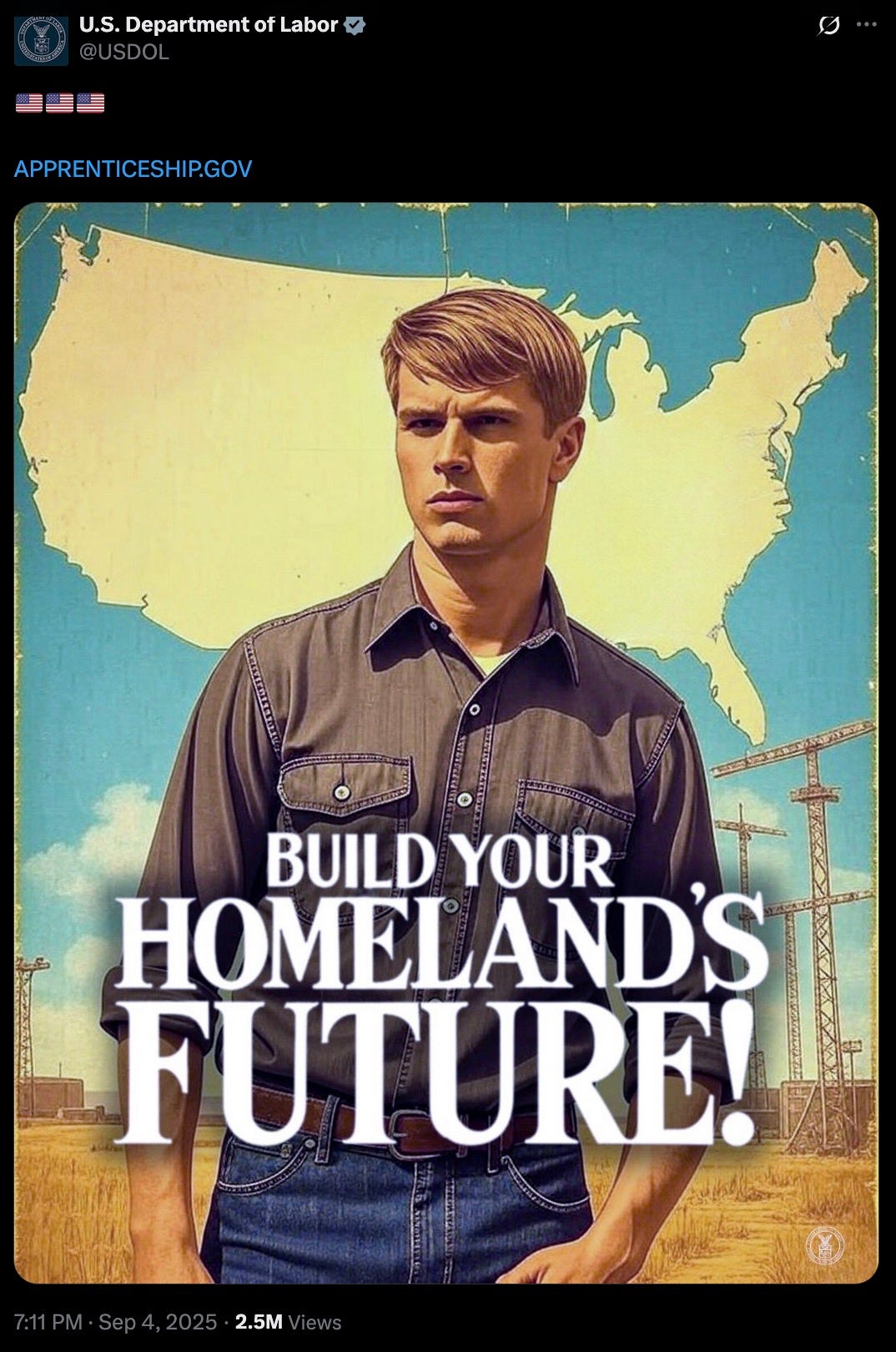 hey, you know who else used to put out posters like this, encouraging its blond white young men with impossibly-cut cheekbones casting dramatic shadows to build for their country’s future? of course you do.