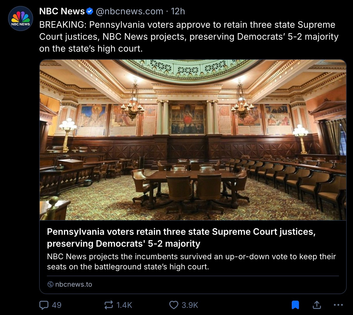 preserving the Democratic majority of Pennsylvania’s Supreme Court is going to go a long way towards preventing any Republican electoral fuckery in PA in 2026 and 2028.