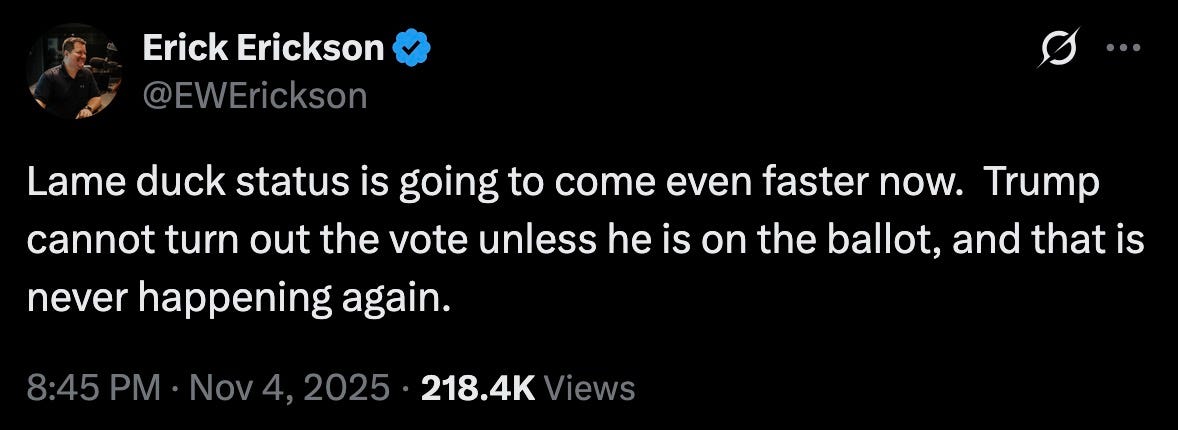 let’s give Erick, the Son of Erick, credit for at least recognizing that Donny can’t ever run for president again — something that all the Chinese-made “Trump 2028” hats in the world can’t change.