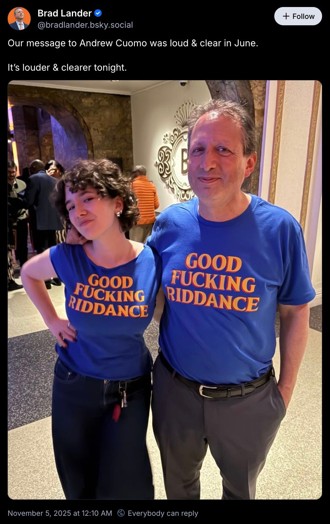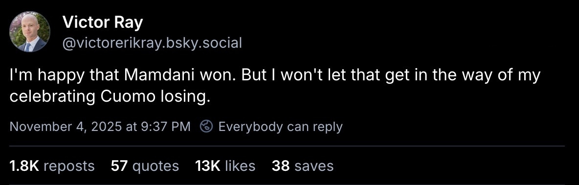 “I’m happy that Mamdani won. But I won’t let that get in the way of my celebrating Cuomo losing.”