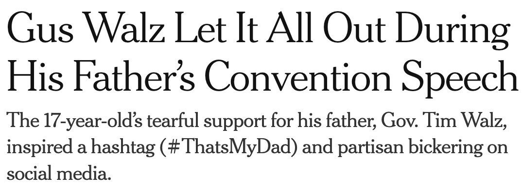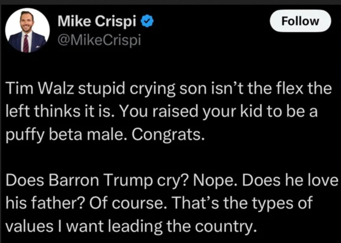 check out childless cat lady Ann Coulter’s lovely comment about Gus Walz’s emotional reaction to his father’s acceptance speech at the DNC.