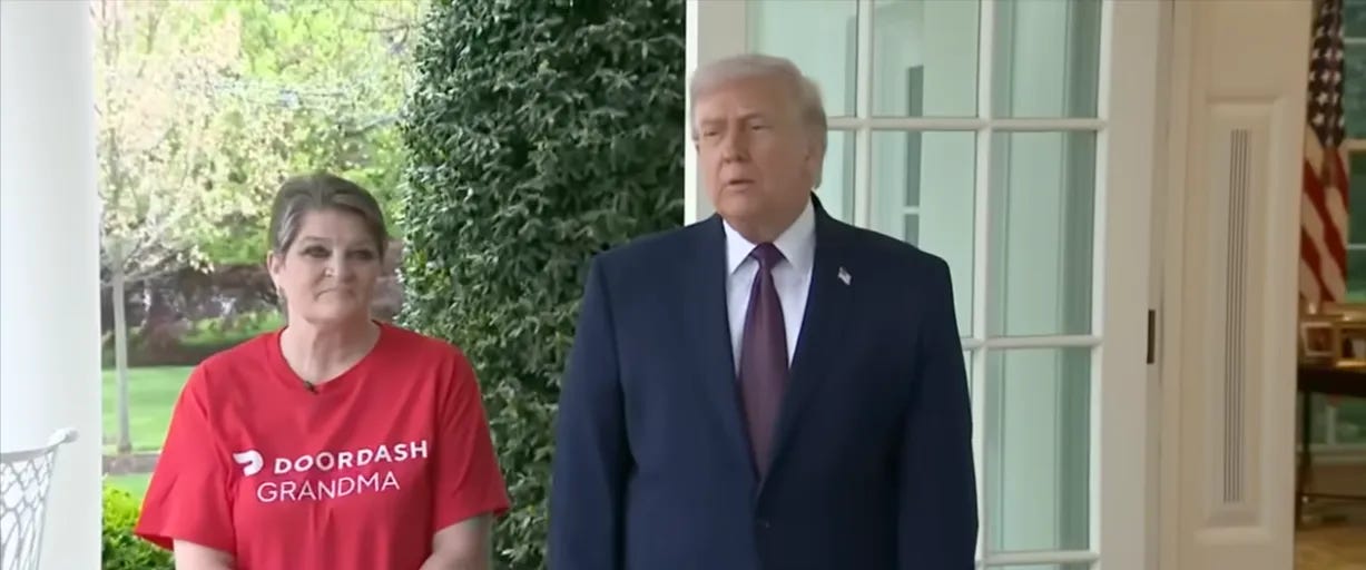 here’s the deal with this ‘Door Dash Granny.’ her name is Sharon Simmons, and she got flown into DC from her home in Fayetteville, Arkansas, to appear in Donny’s dog-and-pony show.