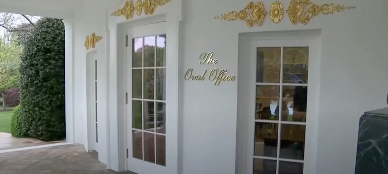 and look at this: Donny’s fuglied up the exterior of the Oval Bordello with the same vulgar crap he slapped onto the inside.
