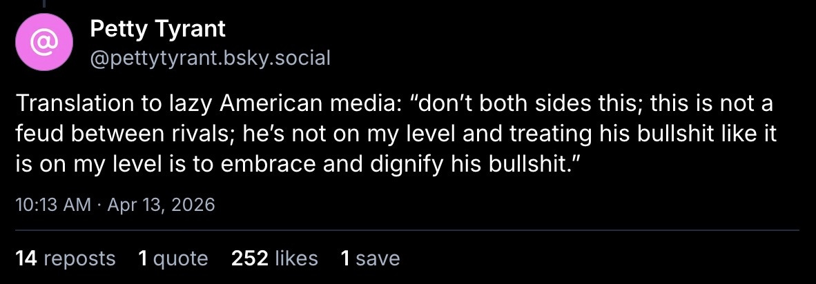“don’t both sides this; this is not a feud between rivals; he’s not on my level and treating his bullshit like it is on my level is to embrace and dignify his bullshit.”