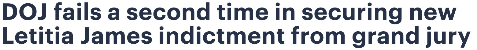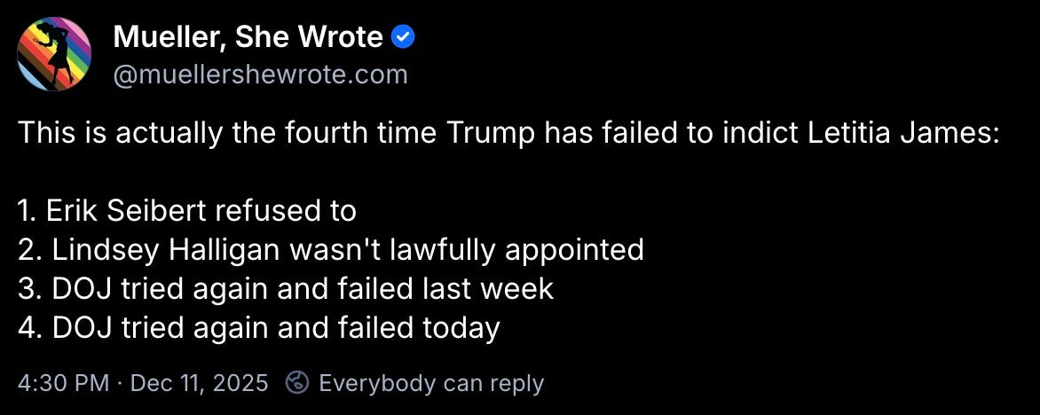 the first failed attempt was when US Attorney Eric Seibert refused to indict James — because he had integrity, and James hadn’t actually broken any laws. Donny then forced Seibert to resign, and replaced him with compliant stooge Lindsey Halligan, who was only too happy to indict James. but then that indictment was tossed after a judge ruled that ‘Donny says I’m the prettiest’ was not a lawful reason for appointing Halligan in the first place.
