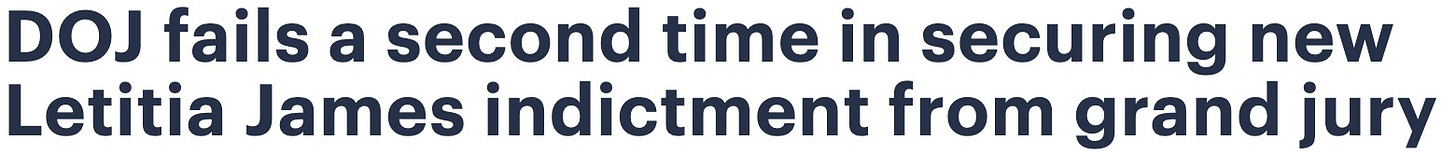 The Department of Justice (DOJ) has failed again to secure a new indictment against New York Attorney General Letitia James (D) after its initial case against her was dismissed, the second time a grand jury has refused to approve charges this month.