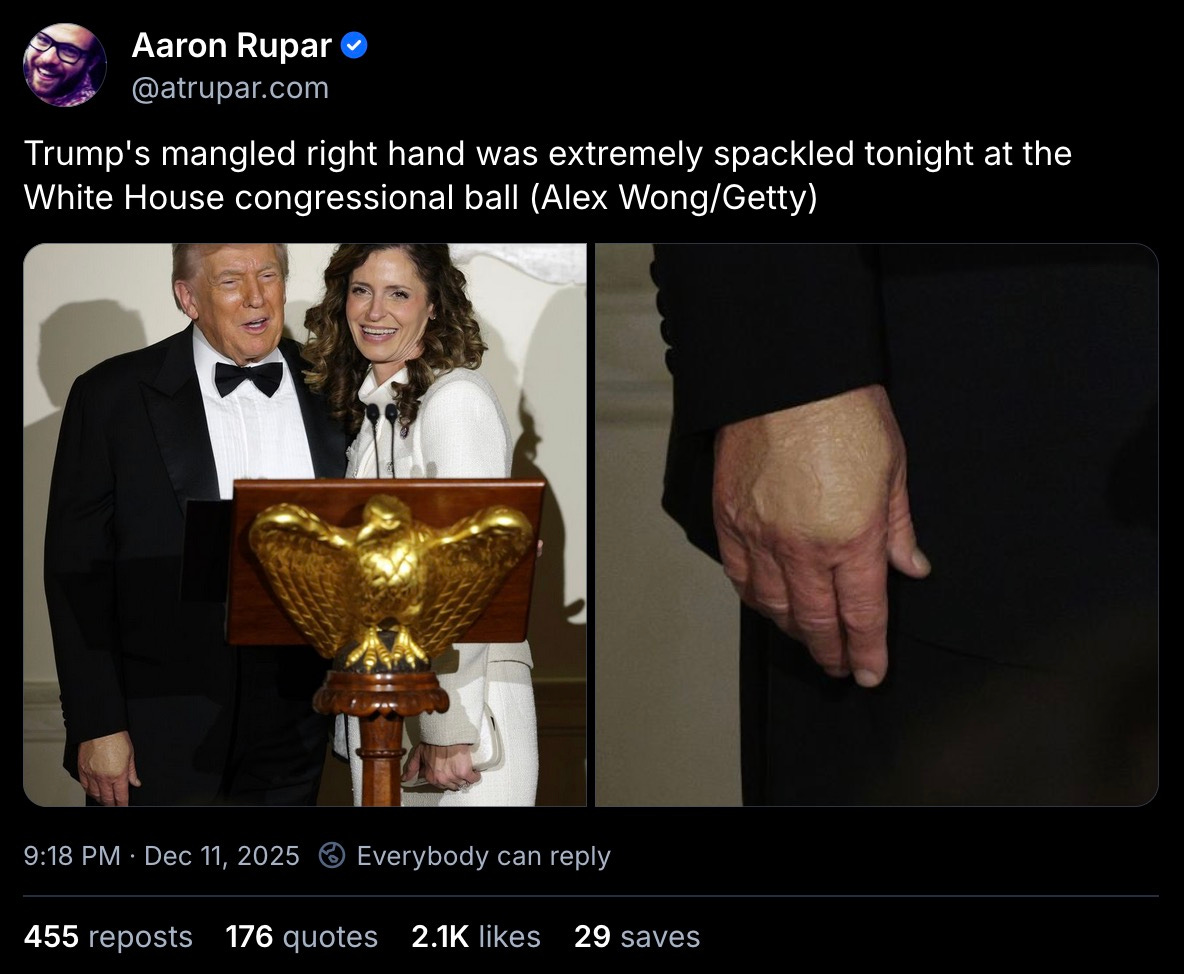 Karoline Lie-vitt: “as for the bandages on his hand, we’ve given you an explanation for that in the past. the president is literally constantly shaking hands. the Oval Office is like Grand Central Terminal. he is meeting with more people than any of you even know about, on a daily basis.”