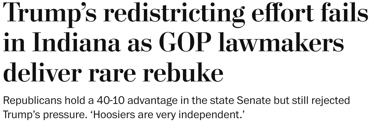 let’s all celebrate Preznit Fuckwit’s waning influence on state-level Republicans. Indiana’s one of the reddest states, and lame-duck Donny (and his ruinous policies) have become so toxic that even Republicans there wanted no part of his election-rigging agenda.