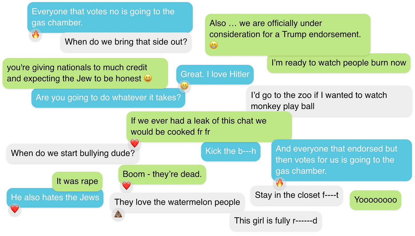 They referred to Black people as monkeys and “the watermelon people” and mused about putting their political opponents in gas chambers. They talked about raping their enemies and driving them to suicide and lauded Republicans who they believed support slavery.