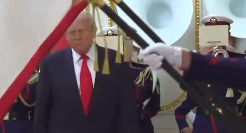 that’s just embarrassing. the squirrel inside Donny’s head gets repeatedly distracted by some shiny object, and Japan’s Prime Minister Sanae Takaichi has to keep taking him by the hand and guiding him to where he’s supposed to go.