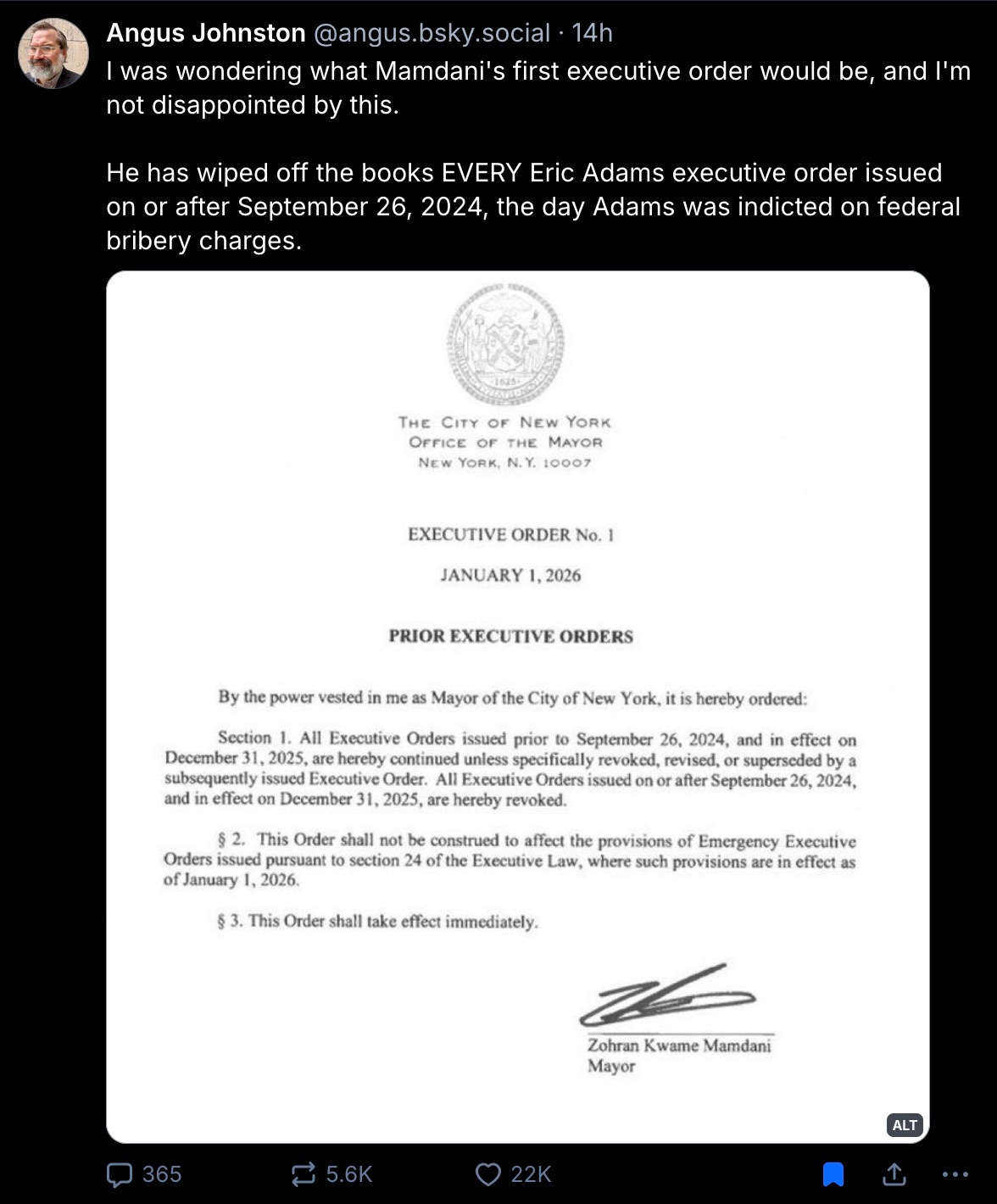 Zohran Mamdani was sworn into office yesterday as Mayor of New York — and here’s one of the very first things he did: he issued an executive order shitcanning a metric fuckload of previous mayor Eric Adams’ executive orders.