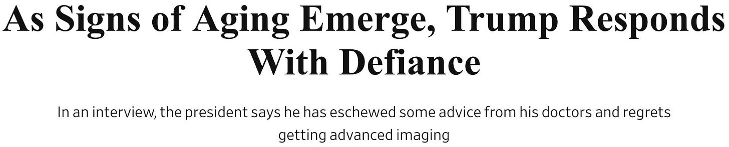 are you sitting down right now? I sure hope so, because here’s some shocking news: it turns out that the guy who lied to us about bone spurs, and lied to us about hush money, and lied to us about his Ukraine phone call — and about a hurricane and covid and the election and his height and his weight and his golf scores and how tariffs work, and about thirty thousand other things — has been lying about his health.