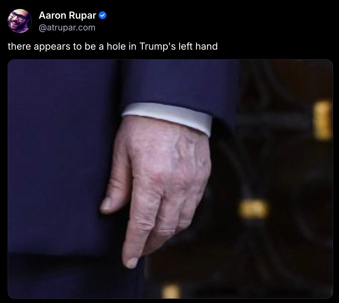 obviously, we’re being lied to. no one is shaking Donny’s hand to the point where the fucking thing looks like someone slammed it in a car door. Donny has clearly been repeatedly receiving intravenous fluids for kind of ailment that they’re hiding from the public. it’s an insult to our intelligence for the White House to insist otherwise.