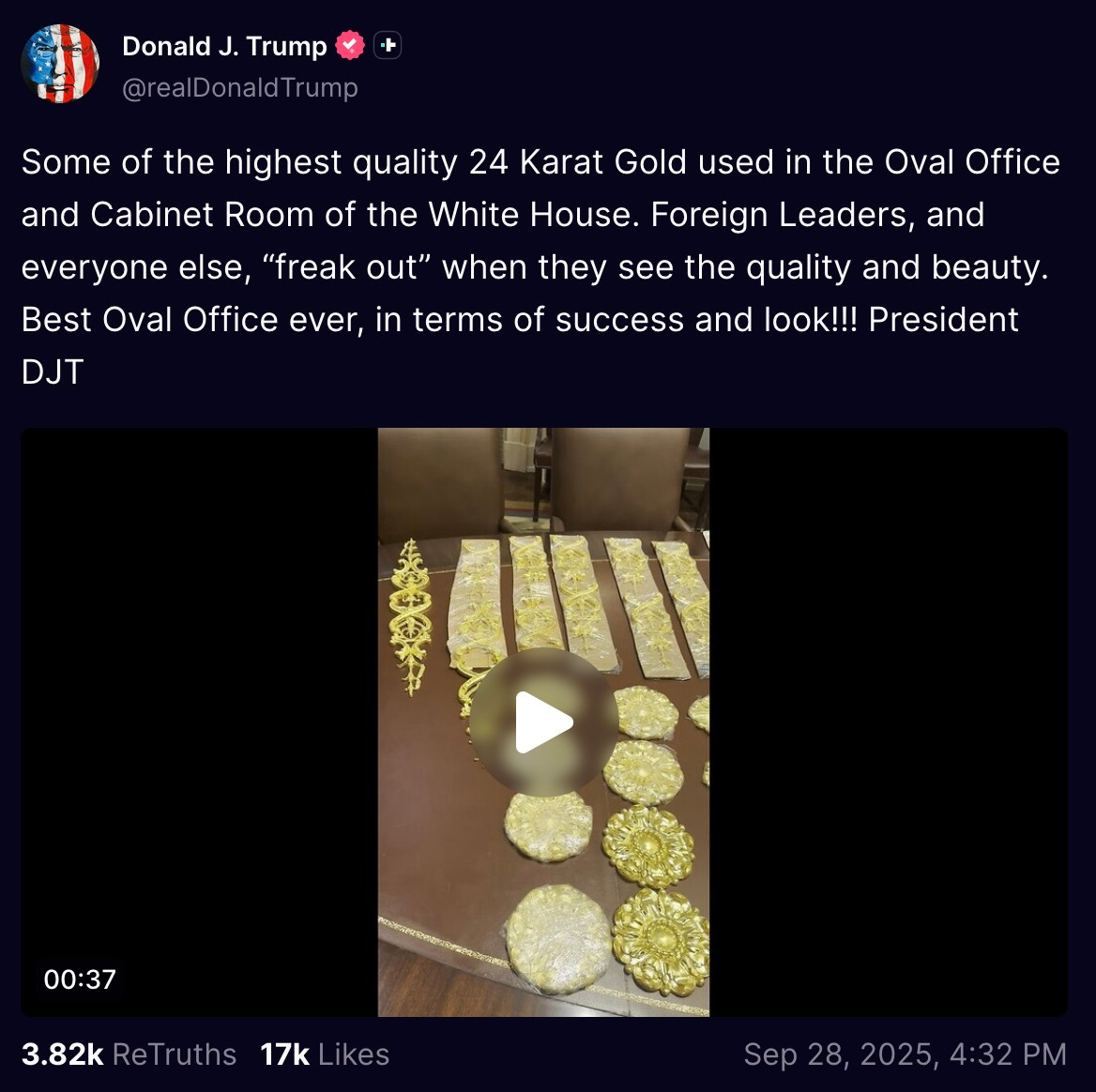 “Some of the highest quality 24 Karat Gold used in the Oval Office and Cabinet Room of the White House. Foreign Leaders, and everyone else, “freak out” when they see the quality and beauty. Best Oval Office ever, in terms of success and look!!! President DJT”