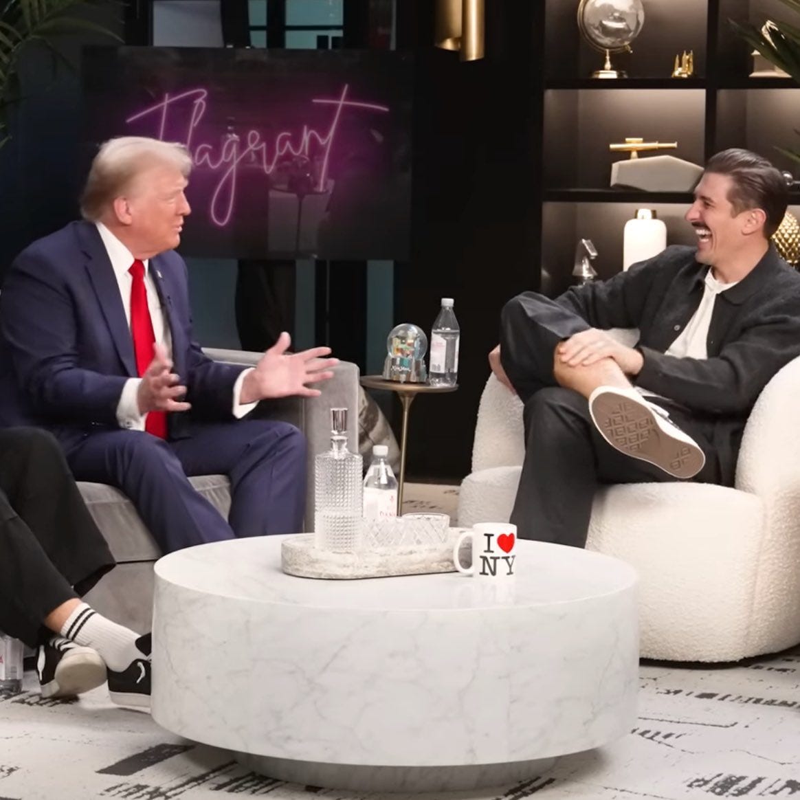 Andrew Schulz and Akaash Singh are hosts of the bro-centric Flagrant podcast. to be fair, they’re not credulous meatheads like Joe Rogan, nor are they performative conspiracy cranks like Alex Jones — but they are bros who backed Donny in 2024, and enthusiastically voted for him.