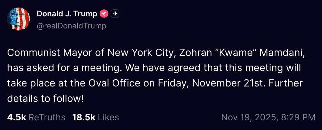 “Communist Mayor of New York City, Zohran ‘Kwame’ Mamdani, has asked for a meeting. We have agreed that this meeting will take place at the Oval Office on Friday, November 21st. Further details to follow!”