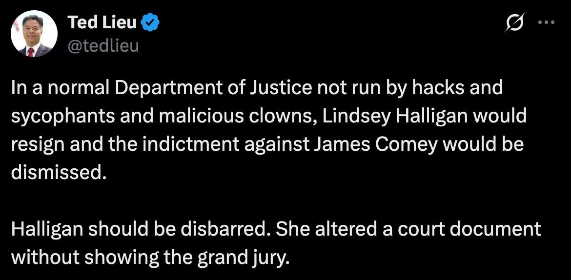 “In a normal Department of Justice not run by hacks and sycophants and malicious clowns, Lindsey Halligan would resign, and the indictment against James Comey would be dismissed. Halligan should be disbarred. She altered a court document without showing the grand jury.”