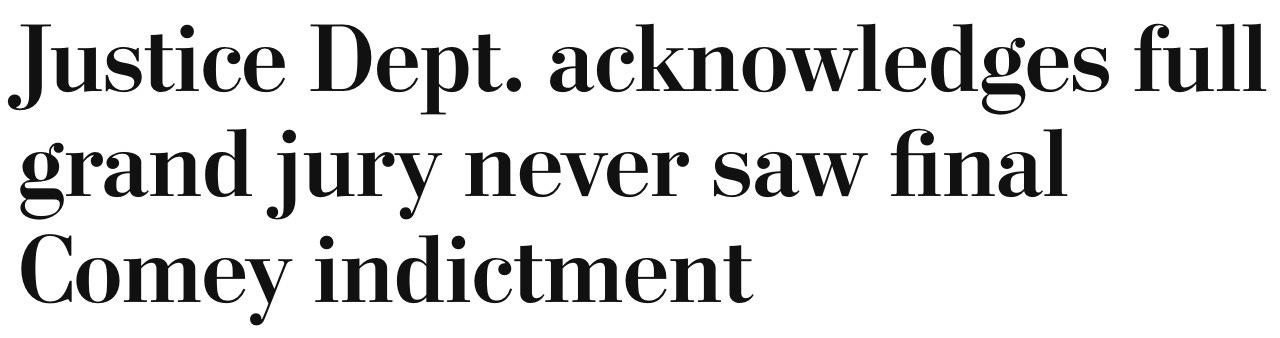 here’s the long story made short: Halligan had originally presented to the full grand jury a three-count indictment against Comey. the grand jury rejected one of the counts, so Halligan drew up a new, two-count indictment. this is where it turns into a shit-show.