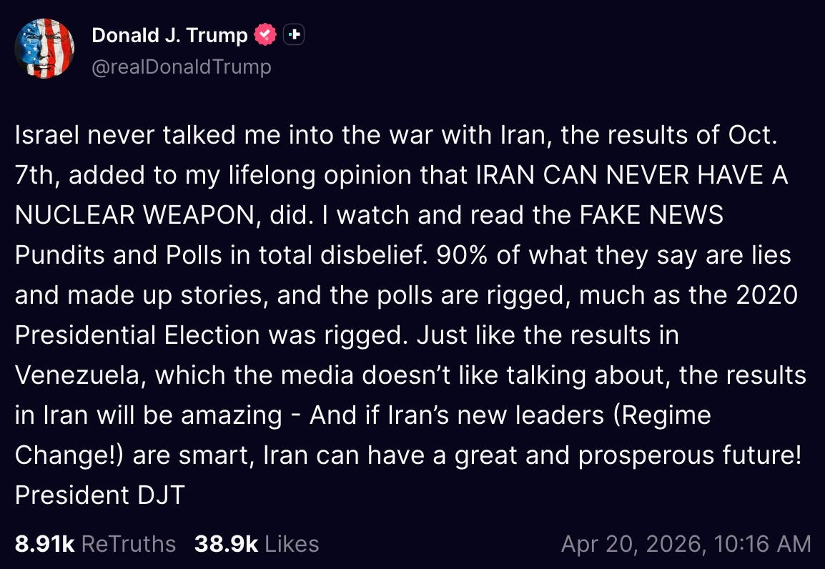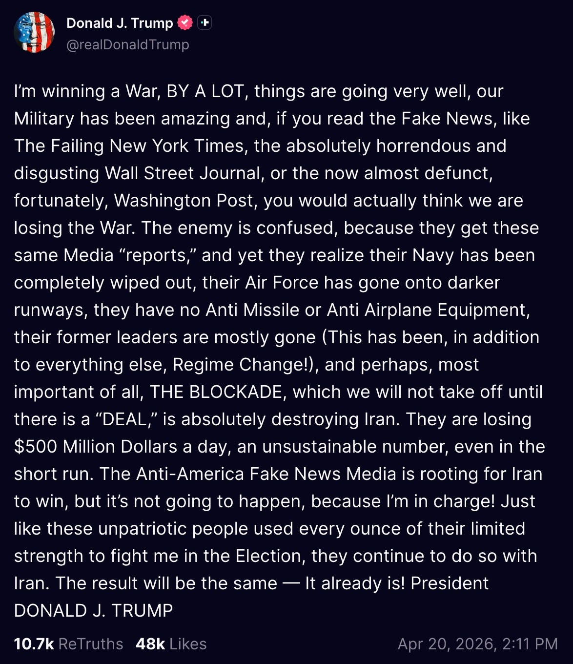 Donny is losing this war — badly. yet he refuses to admit it. he still thinks he can shitpost his way to victory.