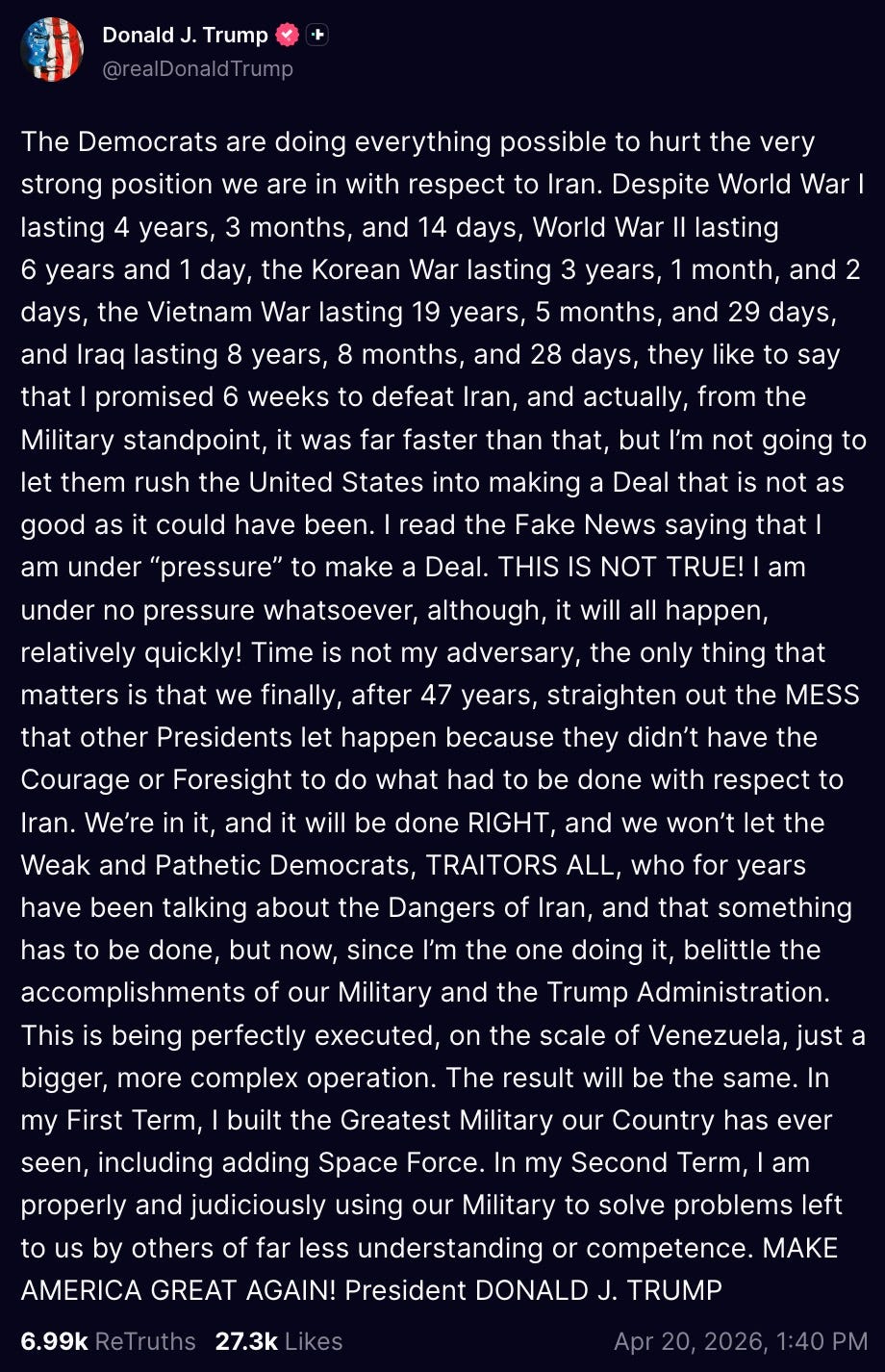 why can’t someone hide Donny’s phone, just for 24 hours — or change the White House wifi password — and let the Shitwit Brigade conduct their negotiations in relative peace and quiet? we might actually get an end to this don’t-you-dare-call-it-a-war, and open the Strait of Epstein™ back up.