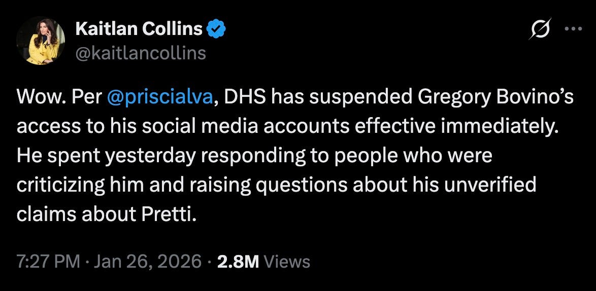 “Wow. Per @priscialva, DHS has suspended Gregory Bovino’s access to his social media accounts effective immediately. He spent yesterday responding to people who were criticizing him and raising questions about his unverified claims about Pretti.”