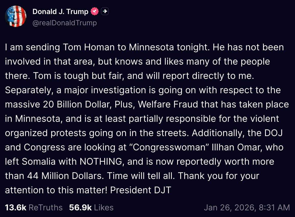 “I am sending Tom Homan to Minnesota tonight. He has not been involved in that area, but knows and likes many of the people there. Tom is tough but fair, and will report directly to me.”