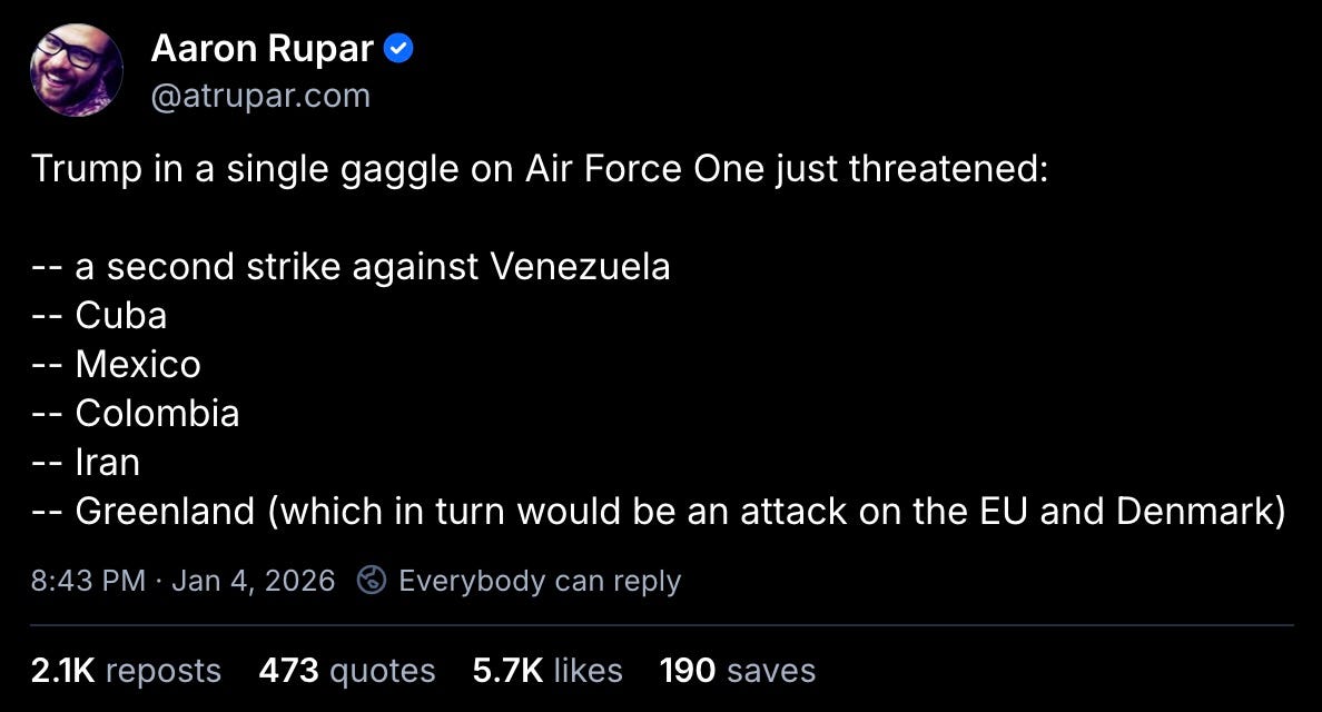 Donny and his toadies are high on their own supply right now. they’ve got exactly one very partial victory under their belt — the extraction of Maduro — and now they’re running around, punching their fists in the air and posturing as if they’ve already won all the wars.