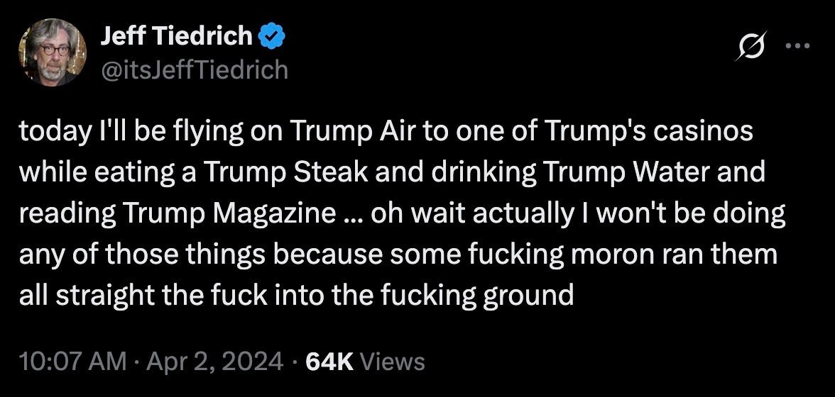 Donny is still a fuck-up. he can’t fight ten wars at once. he hasn’t even finished fighting the first one. he’s going to fuck this up, just like he fucked up the real estate empire he inherited. just like he fucked up running an airline. and casinos. and on and on.